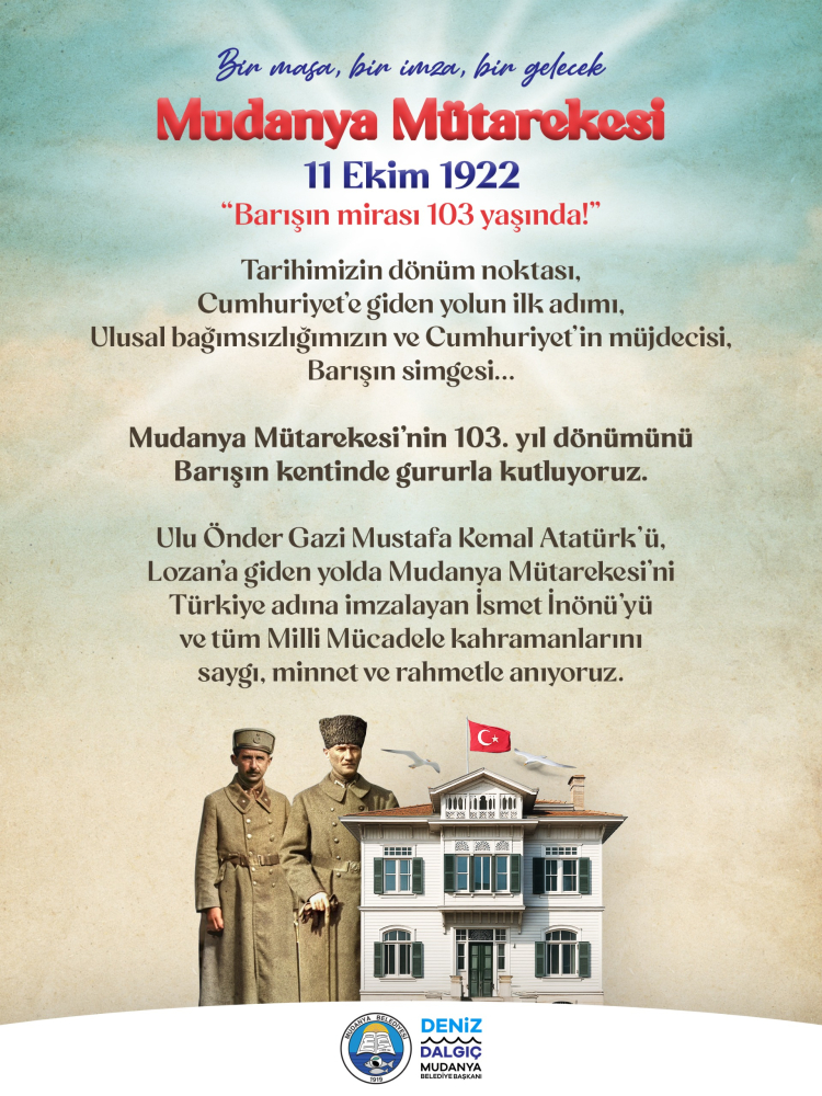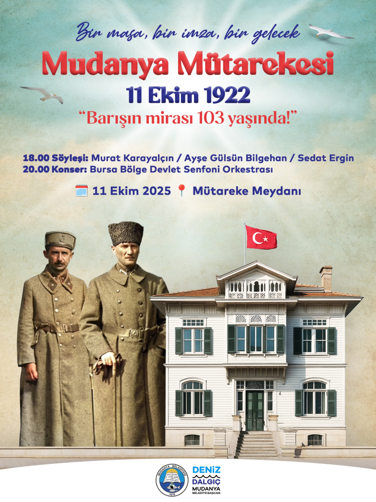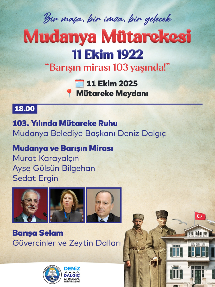 Mudanya Belediyesi, Türkiye’nin bağımsızlık yolundaki dönüm noktası olan Mudanya Mütarekesi’nin 103. yıl dönümünü “Bir masa, bir imza, bir gelecek” temasıyla kutlayacak. Başkan Deniz Dalgıç, “Mudanya, barıştan vazgeçmeyenlerin kentidir” mesajıyla tüm barış sevdalılarını Mütareke Meydanı’na davet etti.