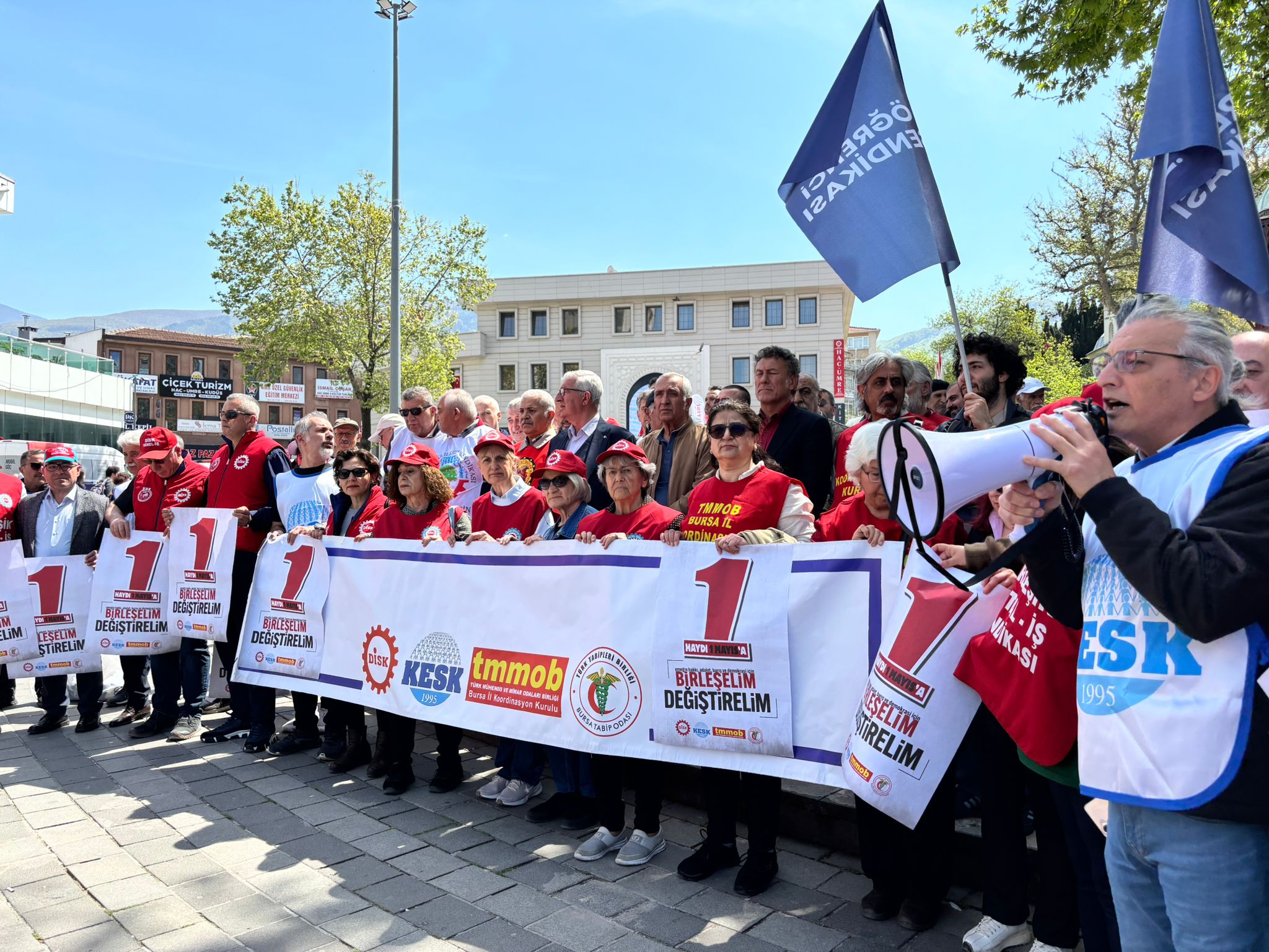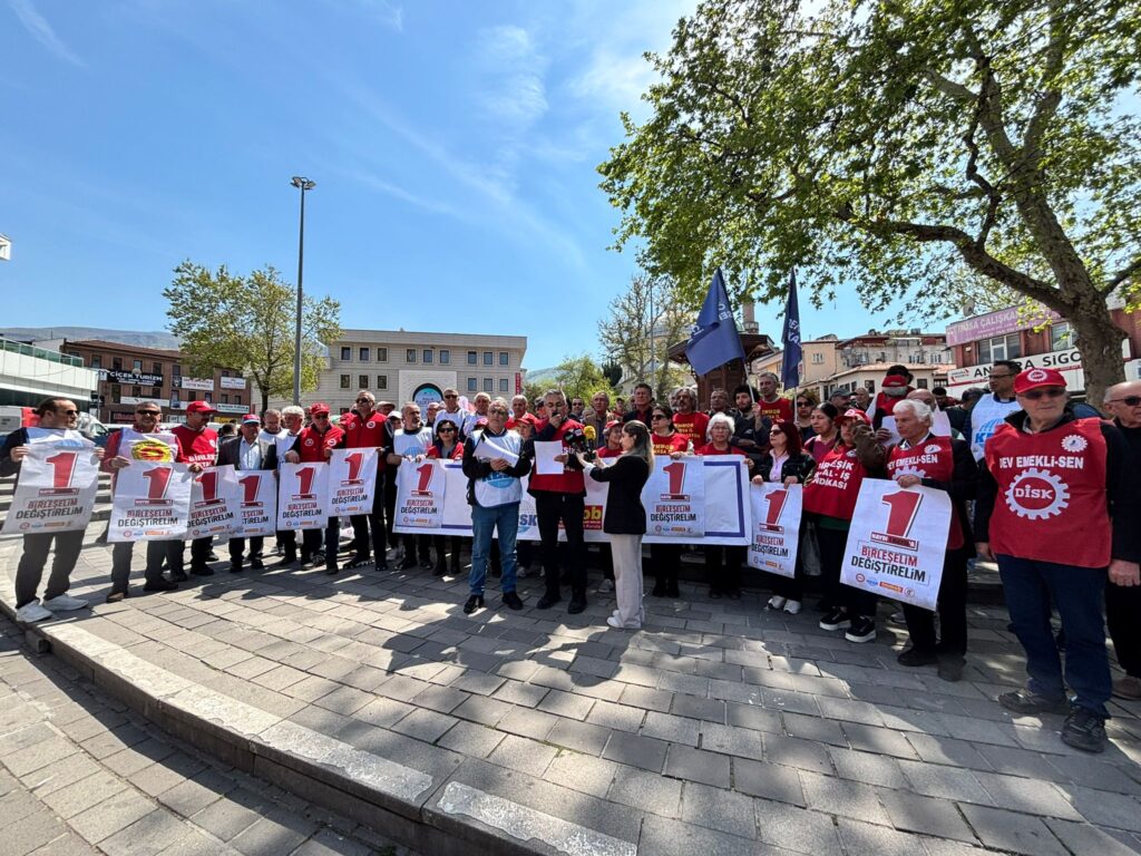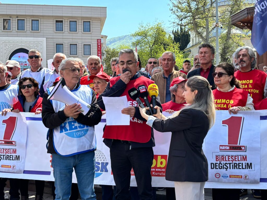 Bursa’da 1 Mayıs Emek ve Dayanışma Günü dolayısıyla DİSK, KESK, TMMOB ve TTB’nin Bursa bileşenleri ortak bir basın açıklaması yaptı. Açıklamada emekçilerin hakları, adalet, barış ve demokrasi konuları öne çıkarılırken, mevcut ekonomik ve toplumsal koşullara yönelik eleştiriler de ifade edildi.