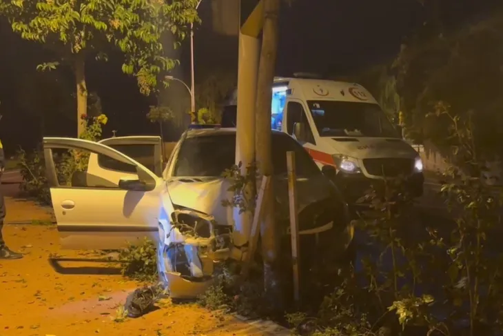 Beton kaldırım bariyerlerini kıran otomobil, elektrik direğine çarparak dururken, sürücü ile araçtaki M.G., B.K. ve F.D. yaralandı.
