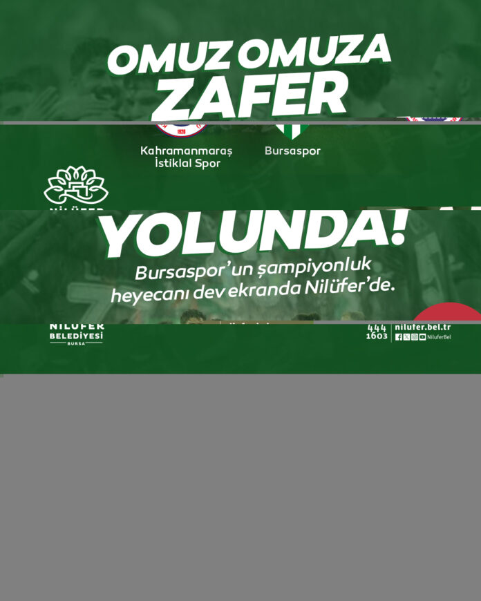 TFF 2. Lig’de şampiyonluk yolunda emin adımlarla ilerleyen Bursaspor, ligin 28. haftasında 14 Mart 2026 Cumartesi günü 13.30’da deplasmanda Akedaş Kahramanmaraş İstiklal Spor ile karşı karşıya gelecek. Nilüfer Belediyesi, Bursaspor taraftarlarının bu önemli maçta takımlarını yalnız bırakmaması için Üç Fidan Gençlik Parkı’nda dev ekran kuracak. Sandalyesini alıp gelen yeşil beyazlı taraftarlar, bu coşkuyu birlikte yaşayacak.