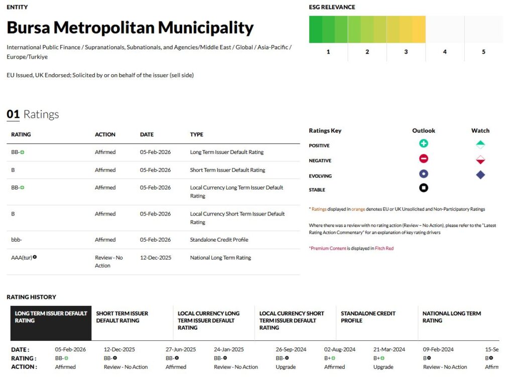 Uluslararası kredi derecelendirme kuruluşu Fitch Ratings, Bursa Büyükşehir Belediyesi’nin uzun vadeli yabancı ve yerel para cinsi kredi notu görünümünü yukarı yönlü revize etti.