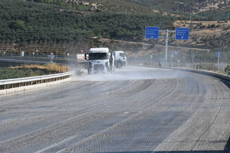 Çalışmaların güvenli yürütülebilmesi amacıyla trafik akışı, gerekli işaretlemeler yapılarak Elbeyli Kavşağı ile İznik Çıkış Kavşağı arasında İznik’in eski çevre yoluna aktarılmış durumda. Bölünmüş yolun sağ platformunda başlayan çalışmalarda, binder kaplama ile aşınma kaplama arasında aderansın sağlanabilmesi için yüzey pürüzlendirme ve temizlik işlemleri sürüyor.