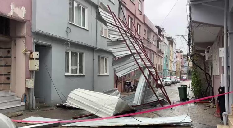 Osmangazi ilçesi Çiftehavuzlar Mahallesi Ihlamur Sokak’taki 3 katlı binanın çatısı yola uçtu, bölgede elektrikler kesildi.