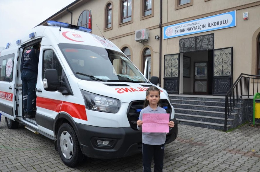 Bursa’da ilkokul 1’inci sınıf öğrencisi Yağmur Şekerci, çok merak ettiği ambulansı yakından görmek için 112 Acil Sağlık Hizmetleri İl Ambulans Servisi Başhekimliği’ne mektup yazdı. Arkadaşlarıyla ambulansa alınıp bilgi verilen Yağmur’un hayali, karne hediyesi olarak yerine getirildi.