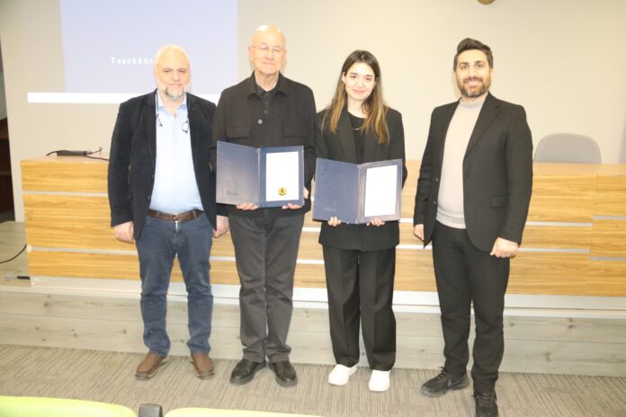 Konuşmalarından ardından Mimar M. Fatih Aydın, MSGSÜ Mimarlık Bölümü Öğretim Üyesi Prof. Dr. Oğuz Ceylân’a, Mimarlar Odası Bursa Şubesi Yönetim Kurulu Üyesi Kurtuluş Göktaş da Yüksek Mimar Deniz Ezgi Ünlü’ye etkinliğe katılımlarından dolayı teşekkür belgesi takdim etti.